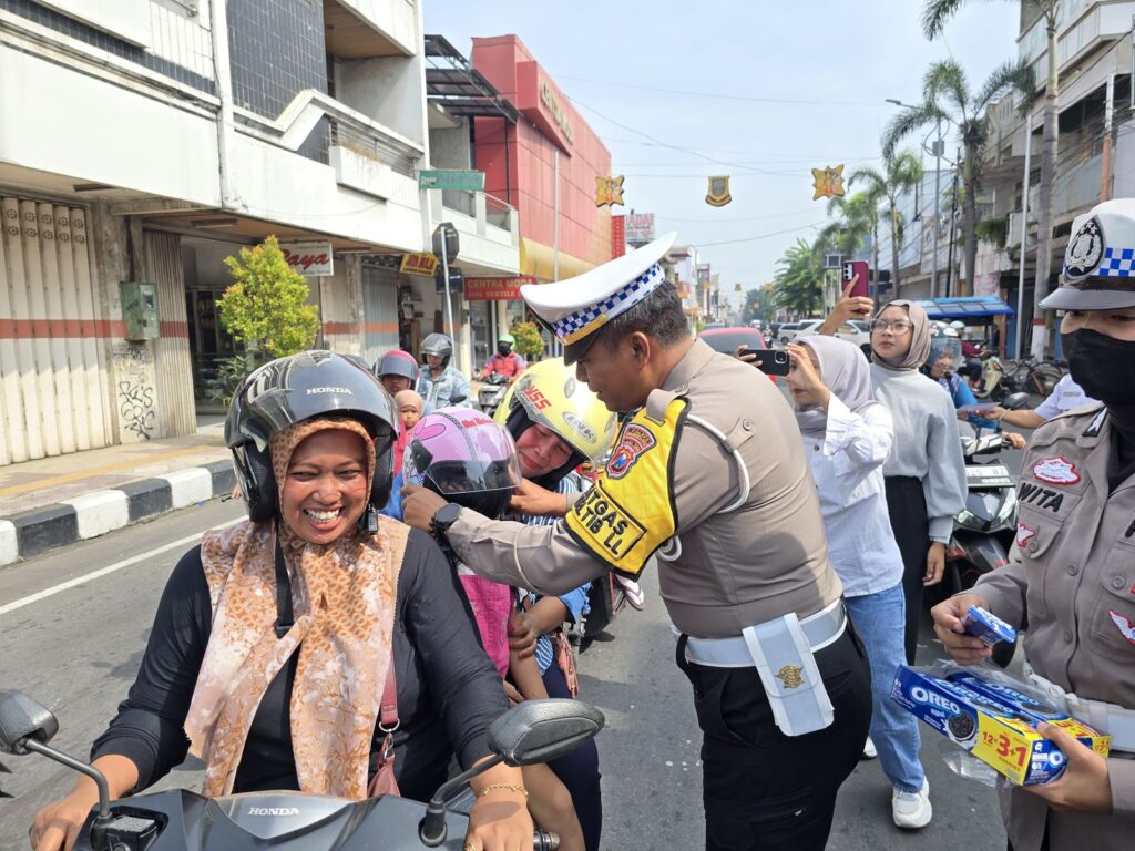 Tidak hanya memberikan himbauan keselamatan berlalu lintas, tetapi petugas juga membagikan helm dan snack kepada para pengendara yang tertib. Kegiatan ini bertujuan untuk meningkatkan kesadaran masyarakat dalam berlalu lintas serta mendorong penggunaan helm sebagai perlindungan utama bagi pengendara sepeda motor.