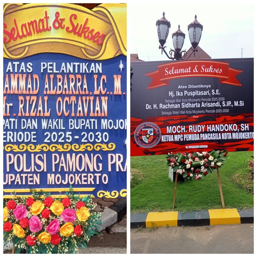 Sementara itu di pelataran komplek kantor Pemerintah Kabupaten Mojokerto, juga terlihat ratusan ucapan yang sama pada H. Muhammad Ali Barra LC. M.Hum dan dr. Rizal Octavian sebagai Bupati dan Wakil Bupati Mojokerto, berdiri rapat dipinggir taman dan pintu masuk rumah dinas Bupati Mojokerto dan kantor Pemerintah Kabupaten Mojokerto. (Jo)