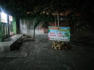 Masih Sugik ” Pedagang disini dan pembeli yang kebanyak dari para pemain maupun suporter saling antri untuk membeli, seperti pedagang pentol keliling yang merapat kesini kelihatannya bolak balik pulang ambil dagangannya 5 kali dan habis, juga Warung DOD yang jual ayam dan bebek bakar kelihatan penuh pembeli, begitu juga pedagang es degan yang jualan di pojok sana, sambil nunjuk lokasinya, juga beberapa kali beli es batu dan degan, serta Warung kopi Mas Johan yang dekat musholla dan lainnya juga ramai, Alhamdulillah para pedagang hari ini laris semua, namun sayangnya pedagang lesehan Ronggo Lawe belum buka, karena bukanya malam, habis magrib.”