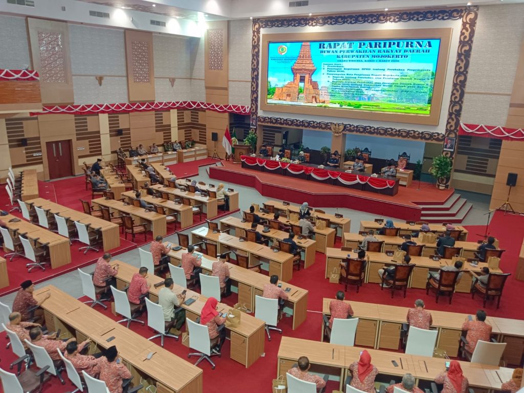 MOJOKERTO, Jejakjurnalis.id – Dewan Pimpinan Rakyat Daerah (DPRD) Kabupaten Mojokerto melaksanakan rapat paripurna di Ruang sidang Graha Whicesa DPRD Kabupaten Mojokerto Jalan RA. Basuki 35 Sooko Mojokerto, pada Kamis (5/3).