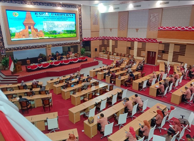 MOJOKERTO, Jejakjurnalis.id – Dewan Perwakilan Rakyat Daerah (DPRD) Kabupaten Mojokerto menggelar paripurna untuk mendengarkan jawaban Bupati Mojokerto terhadap saran masukan dari Fraksi-Fraksi DPRD Kabupaten Mojokerto dj Ruang Sidang Graha Whicesa Jalan RA. Basoeni 35 Sooko Kabupaten Mojokerto, Kamis (24/7). Siang.