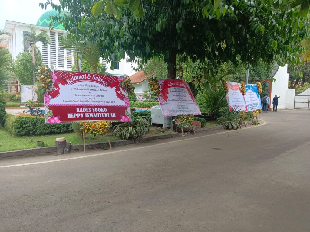 Hal tersebut, tampak jelas sebanyak 15 karangan bunga yang berdiri menutupi taman di halaman Pemkab. Mojokerto. Karangan bunga tersebut berbunyi “selamat dan sukses atas terpilihnya Dr. Muhhamad Al Barra.Lc, M.Hum dan dr. Muhammad Rizal Oktavian sebagai Bupati dan Wakil Bupati Terpilih Mojokerto 2025-2030.”