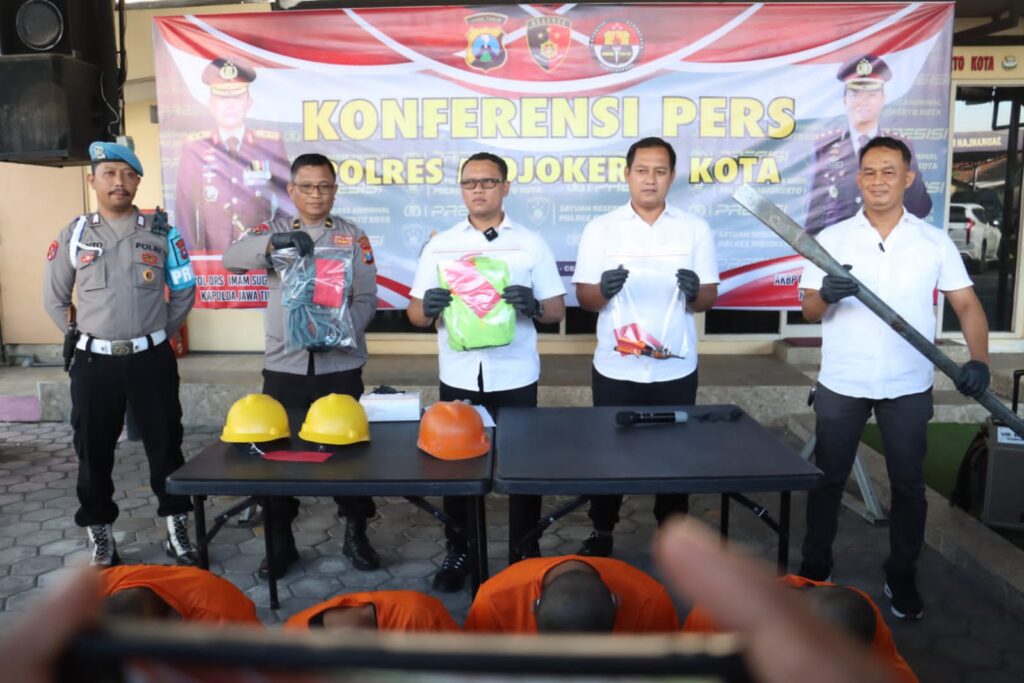 Lanjutnya dijelaskan, bahwa para pelaku berhasil diamankan Personel Satreskrim saat melancarkan aksinya, “aksinya dilancarkan tengah malam dan berhasil kami amankan bersama barang bukti 1 buah tangga bambu, gunting plat dari besi, linggis, tali tampar, 4 buah rompi hijau dan 10 tiang besi kabel fiber optic diangkut menggunakan mobil Grand Max warna Hitam” Ungkapnya