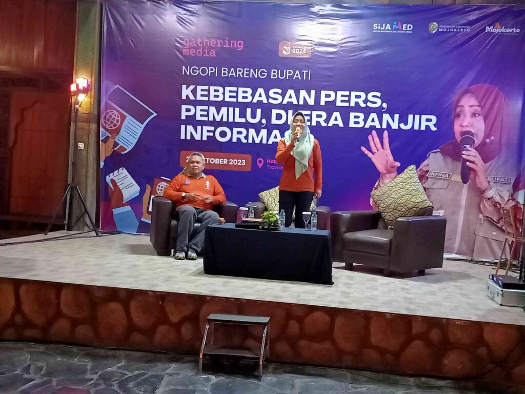 Drs. Ardi Sepdianto, M. Si Kepala Dinas Komunikasi dan Informatika Kab. Mojokerto mengatakan ” bahwa peran media menjadi jujukan bagi masyarakat agar tahu akan kejadian atau berita yang sebenarnya, utamanya pada saat ini ditengah-tengah tahapan pemilu, 2024 banyak terjadi banjir informasi.” Terangnya.