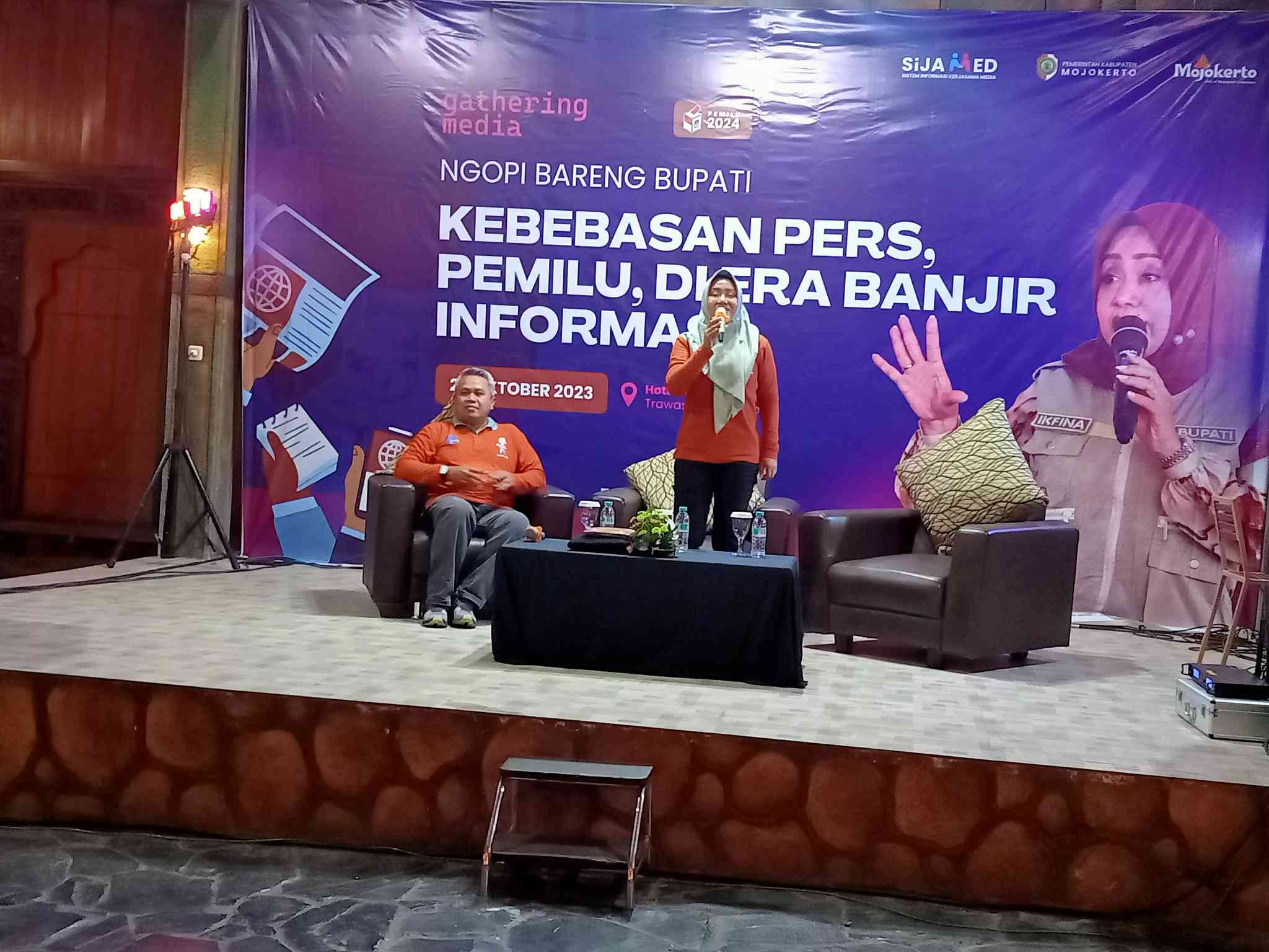 Mojokerto, Jejak jurnalis,id – Menjelang Pemilu 2024 yang akan datang, Diskominfo Kabupaten Mojokerto menyelenggarakan Ngopi Bareng Bupati dengan tema “Kebebasan Pers, Pemilu, Diera Banjir Informasi.” yang dilaksanakan di Hotel Arayana Trawas Mojokerto, Selasa, 24/10/2023, malam.