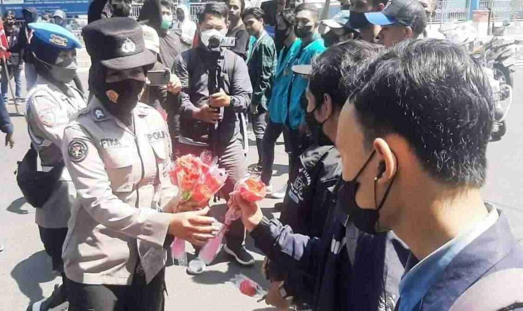 Begitu pula para Polwan Polresta Banyuwangi yang turut mengawal aksi demo BEM Banyuwangi tak ketinggalan menghampiri peserta aksi dengan membagikan bunga mawar merah.