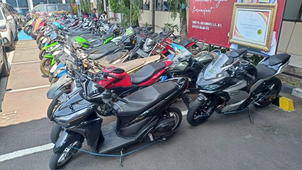 Semua kendaraan roda dua yang melanggar tersebut, saat ini diamankan di halaman depan dan belakang Polresta Malang Kota.
