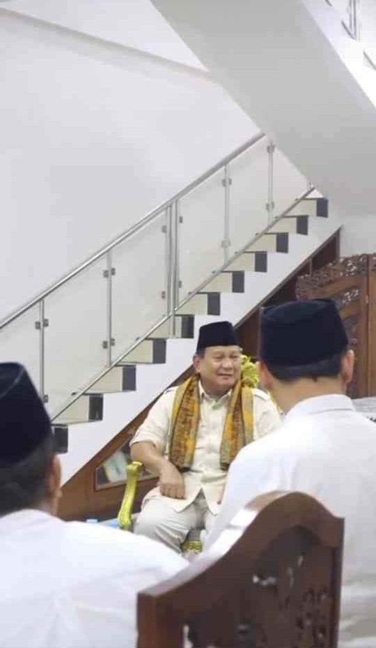 Setelah mengikuti sholat berjamaah, Prabowo bersama Kh. Asep dan Gus Barra makan siang bersama diikuti tamu lainnya.