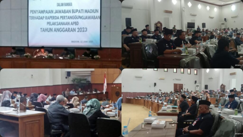 Madiun, Jejakjurnalis.id – DPRD Kabupaten Madiun menggelar Rapat Paripurna, terkait Jawaban Bupati terhadap Rancangan Peraturan Daerah (Raperda)  tentang Pertanggungjawaban Pelaksanaan Anggaran Pendapatan dan Belanja Daerah (APBD) Tahun Anggaran 2023, Rabu (12/6/2024).