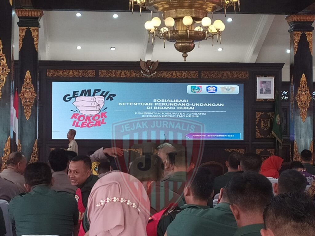 Jombang, Jejakjurnalis.id – Gempur Rokok ilegal menjadi tagline yang menggambarkan wujud komitmen Pemerintah dalam rangka menekan peredaran rokok ilegal. Tujuannya untuk mengamankan penerimaan Negara dari cukai hasil tembakau atau rokok. Untuk mendukung program ini, Pemkab Jombang melalui Satpol PP setempat bersama Kantor Pengawasan dan Pelayanan Bea dan Cukai Kediri melaksanakan kegiatan Sosialisasi Ketentuan Peraturan Perundang-undangan di Bidang Cukai dengan sasaran kepada 400 peserta yang berasal dari masyarakat umum, Pemdes, Babin Kamtibmas, Babhinsa, dan kalangan Mahasiswa di Pendopo Jombang, Kamis (23/11/2023), pagi.