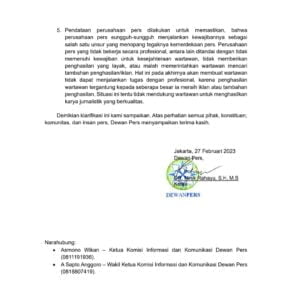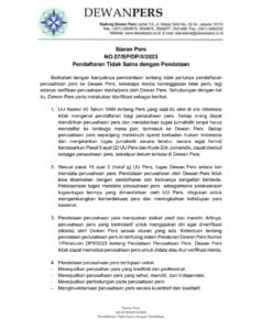 Surabaya, Jejakjurnalis.id– Dewan Pers mengeluarkan siaran pers nomor 07/SP/DP/II/2023 tertanggal 27 Februari 2023 berkaitan dengan banyaknya pemberitaan tentang tidak perlunya pendaftaran perusahaan pers ke Dewan Pers.